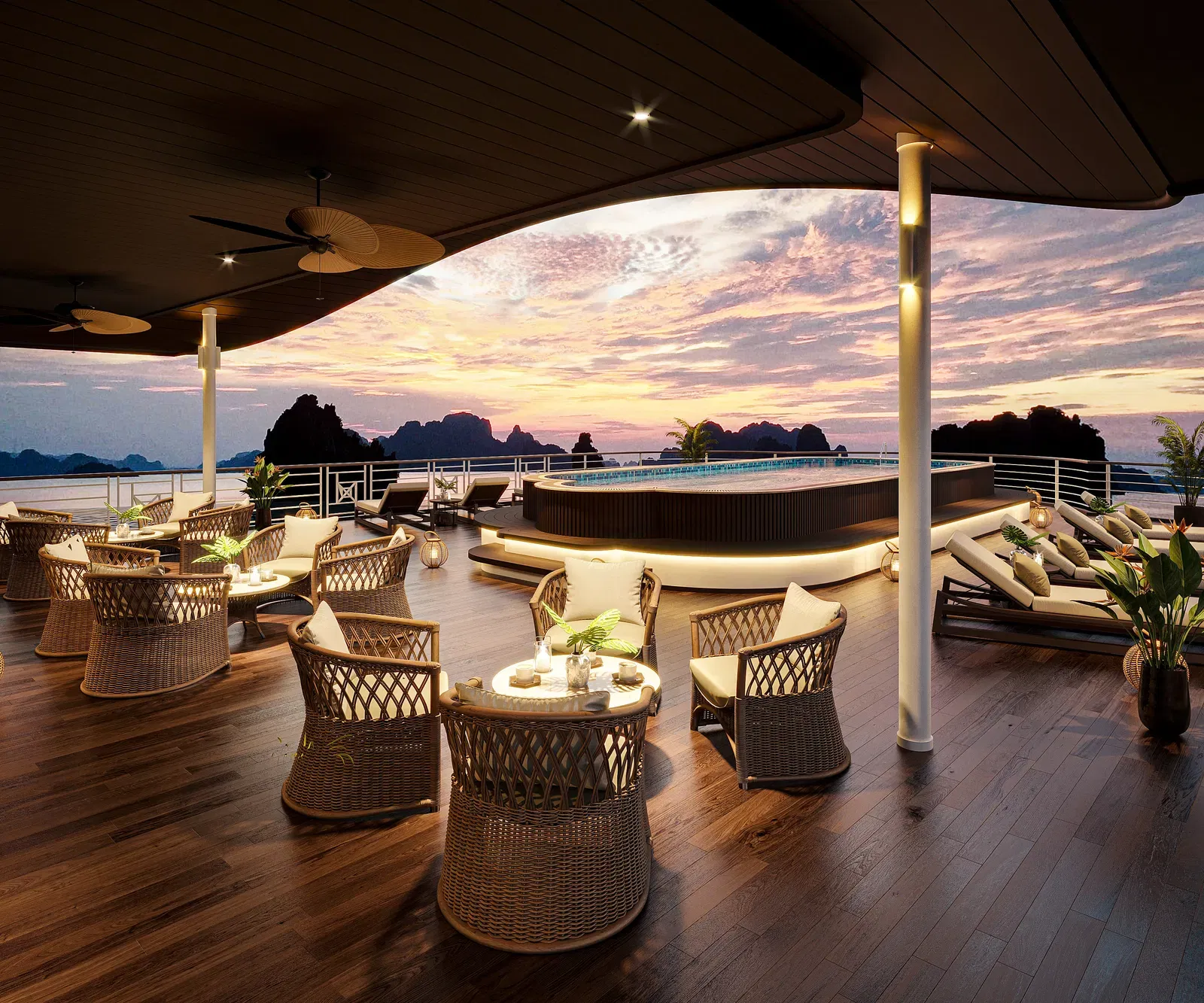 - Highlight features: Intimate 29-suite design; Indochine-inspired interiors; panoramic bay-view dining; Amber Sky Bar on the sundeck; Sundara Jacuzzi Pool at the bow of Deck 3; Serene Spa & Massage; sundeck gym; elegant Amethyst Lounge.